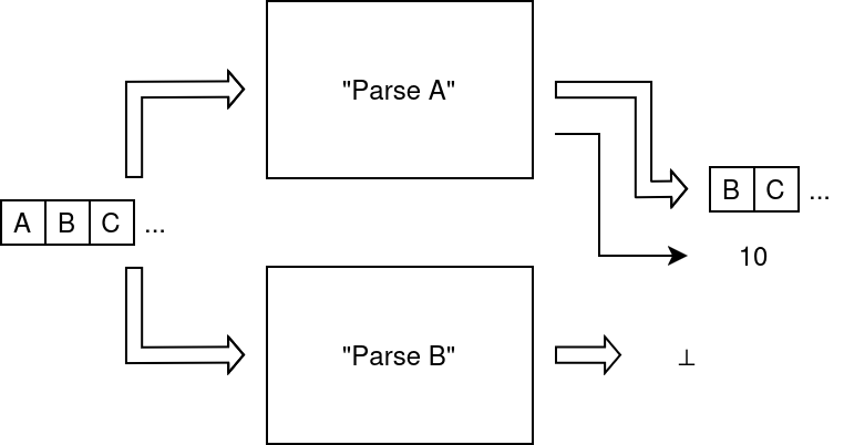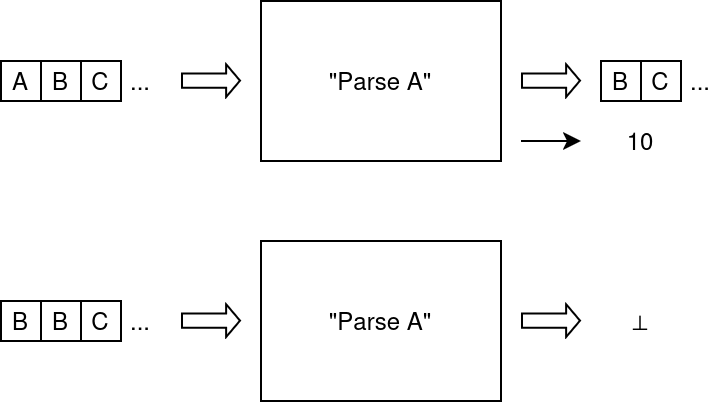As you can see on the figure, recognizing symbol A yields the intended result (10) and also the remainder of the stream, excluding what was recognized. Failing to recognize a symbol, the parser yields ⊥ (bottom or up-tack), which symbolizes failure.