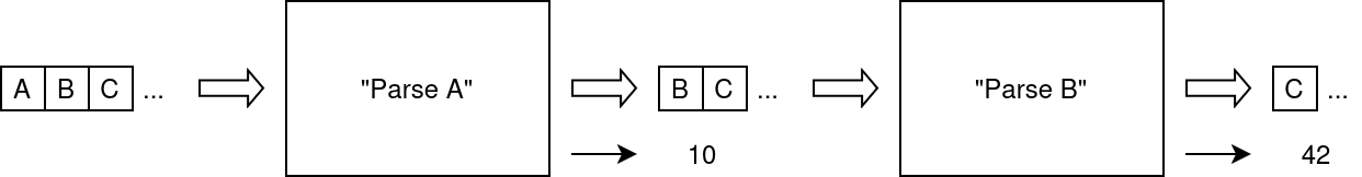 In the example above, the first parser succeeds in parsing A from ABC… and outputs 10 and BC…; then the second parser succeeds in parsing B and outputs its own result (42) and the remainder C… (what happens to the first result is a matter of “taste”: it may be composed with the second result, or discarded altogether, we will see what this entails later).