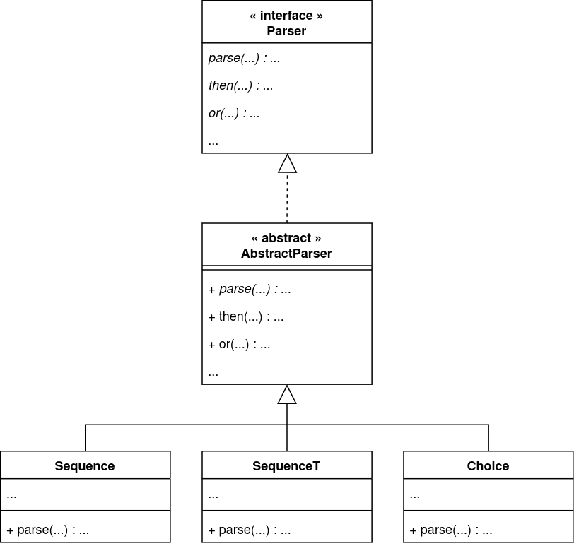 public abstract class AbstractParser<Sym,St,R> implements Parser<Sym,St,R> { @Override public Parser<Sym,St,R> or(Supplier<Parser<Sym,St,? extends R>> right) { return new Choice<Sym,St,R>(this, right); } @Override public <R2> Parser<Sym,St,? extends R2> then(Supplier<Parser<Sym,St,? extends R2>> right) { return new Sequence<Sym,St,R,R2>(this, right); } @Override public <R2> Parser<Sym,St,? extends R2> then(StateStreamFunction<Sym,St,R,Parser<Sym,St,? extends R2>> right) { return new SequenceT<Sym,St,R,R2>(this, right); } ... } |